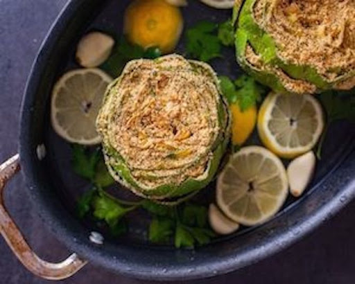 - 3 cups chicken broth, or enough to come 1/3 of the way up the artichokes