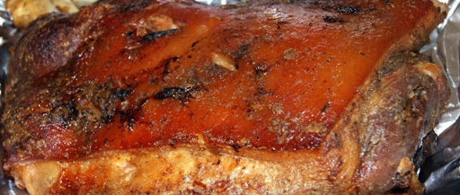 Place pork in aluminum turkey pan (skin side up) and cover with aluminum foil tightly.