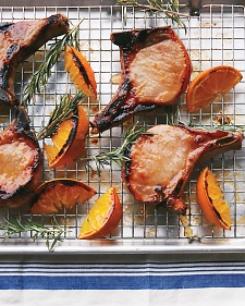 Heat broiler, with rack in upper third of oven. Broil pork and oranges 3 minutes, then flip pork, brush with reduced marinade, and add rosemary. Broil until pork is lightly charred and cooked through, 5 to 7 minutes. Brush with more reduced marinade and serve.