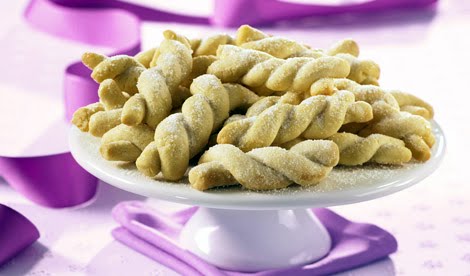 4. Assembly: Roll each ball into an 8” (20 cm) rope (if dough cracks just squish together). Cut rope in half. Make an X with ropes. Twist to form cookies. Place on parchment spacing 2” (5 cm) apart. Repeat with remaining log. Generously sprinkle with sugar.