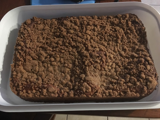 5. Spread batter (which is doughy) into a well greased 9x13 pan and cover with the topping.