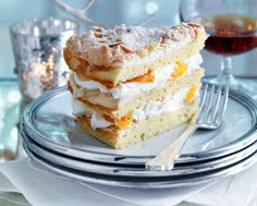 6. Set aside best-looking cake round for top layer. Place 1 round on cake plate; spread with half of cream. Dot with half of fruit. Top with another round. Repeat with cream and fruit.