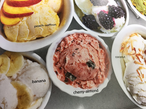 Roast 1lb thawed frozen sliced peaches in a 450 degree oven until beginning to caramelize; puree with 4 tsp fresh lemon juice, a rounded 1/2 tsp ground cardamom, 1/2 tsp orange blossom water, and 10 threads saffron. Add 1/4 cup honey and peach puree to the yogurt base before chilling.