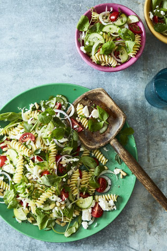 Once pasta has cooked, drain and toss in a large salad bowl with cucumbers, cherry tomatoes, feta, pine nuts, pea shoots, baby arugula, mint, parsley, chives, Belgian endives, red onion. If you like, add or swap in fresh fennel, cooked potatoes, cooked green beans or cooked fava beans.