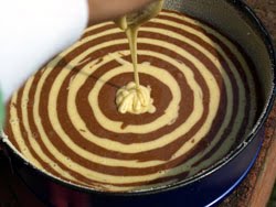Take a lined cake tin and pour 2 to 3 tablespoons of the white mixture into the centre, creating a small circle. Next take 2 to 3 tablespoons of the dark mixture and repeat. If you’re careful you should find concentric circles of alternating colours forming in the tin. Repeat until all the mixture is used.
