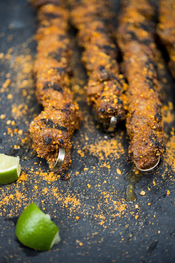 Grill the skewers, covered, until well charred all over, about 5 minutes, flipping halfway through. Transfer to a plate and let rest for 5 minutes. Brush the lime juice on both sides of the skewers, then sprinkle with the reserved spice mix. Serve with lime wedges.