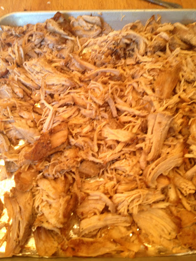 Preheat broiler. Line a baking sheet with foil. Place the shredded meat on the cooking sheet and pour a few spoonfuls of sauce over the top Broil for 5 minutes.