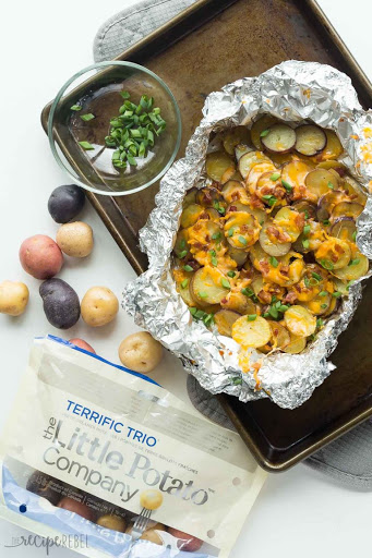 Repeat layers two more times until all potatoes, cheese and bacon are used. Fold up the sides (if using a skillet or pan, you may want to cover with foil to keep the heat in) and pinch the top closed. Place directly on heat, cover grill and cook for 10-20 minutes, until potatoes are tender all the way through. Open foil and sprinkle with green onions. Serve immediately.