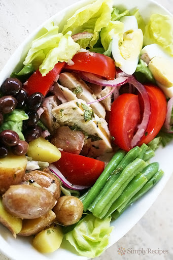 In large bowl, toss greens with vinaigrette and top with chilled potato mixture. Garnish with eggs, tomatoes, capers and anchovies.