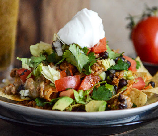 Heat the broiler on your oven. Add half of the cheese over top of the chips. Evenly spread turkey over the cheese and chips, then cover with the black beans and remaining cheese. Place under the broiler for 1-2 minutes, just until cheese is melty and gooey and the chips are warm. Remove from the oven and immediately cover with tomatoes, lettuce, onions, avocado and cilantro. Serve with yogurt/sour cream and chives. (AND BEER.)