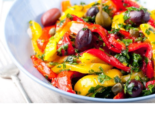 - Meanwhile, crush the garlic and a generous pinch of salt to a paste using a pestle and mortar. Add the vinegar and oil, and blend to make a dressing. Strip the skins and seeds from the peppers, then cut into pieces. Place in a bowl.