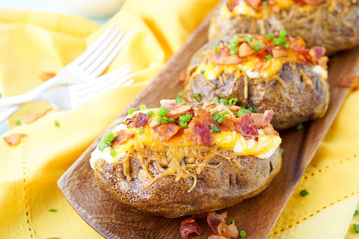 Open up the potatoes immediately after removal from the oven in step 3 so steam can escape. Top them as desired, or with one of our toppings.