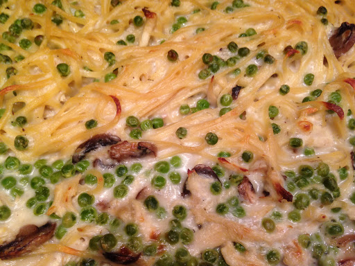 Cook pasta 2 minutes less than package instructions for al dente; drain and return to pot. Add sauce, chicken, peas, and mushrooms. Toss well to combine. Divide between two shallow 2-quart baking dishes; sprinkle with remaining Parmesan. Freeze (see below) or bake until browned, about 30 minutes. Let stand 10 minutes before serving.