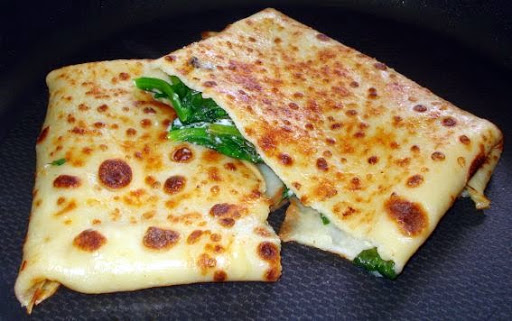 Quickly, use your hand and spatula, fold the crepe into envelope shape and turn over other side. Cook for another 2 minutes or until the cheese melted. Serve hot.