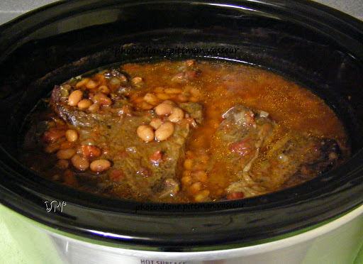 Place the cover on the crock pot and cook on HIGH setting for 4 - 5 hours, or until roast falls apart and the beans are tender, adding more water as needed. Taste and adjust seasonings to your taste.