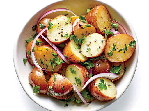 Place potatoes in a Dutch oven; cover with water. Bring to a boil; reduce heat, and simmer 12 minutes or until tender. Drain. Combine olive oil, lemon juice, pepper, anchovy paste, salt, and garlic in a large bowl. Stir in potatoes, onion, and parsley.