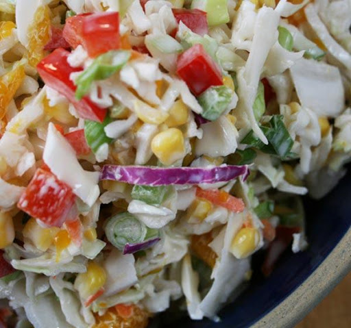 Combine coleslaw mix, 3 tablespoons green onions, red and green pepper, corn and oranges, reserving 6 orange segments for garnish. Mix together mayonnaise, sugar, vinegar and juice; blend well. Pour over salad and toss to coat well. Garnish with remaining green onions and reserved orange segments. Transfer to a pretty serving dish.