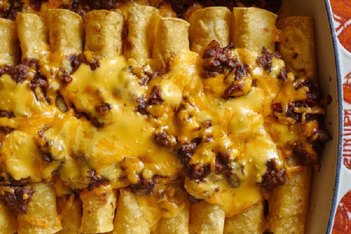 Assemble the enchiladas: Using a ladle, put about 1/2 cup chili in the bottom of a 9-by-13-inch baking pan and spread it out a little. Roll a few tablespoons of cheese into each tortilla, along with a tablespoon or so of chili, then place it seam-side down in the pan, nestling each one against the last. Ladle remaining chili over top of rolled tortillas and sprinkle with remaining cheese.
