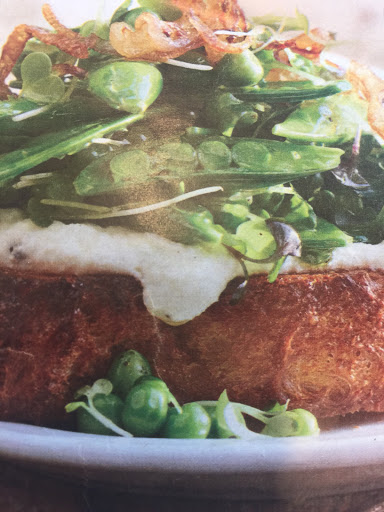 Spread toasted bread slices generously with ricotta. Toss peace and P shoots together; mild over Recada. Spoon shallot mixture over all. Drizzle with vinegar. Sprinkle with flaky sea salt.