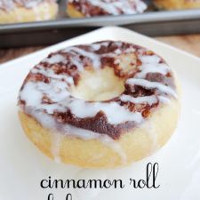 Dense, cake-like donuts are baked then topped with cream cheese glaze or cinnamon sugar. You don't necessarily need a donut pan, the batter is thick so it can be piped into circles onto a parchment line baking sheet.