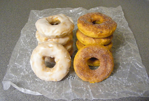 In a mixing bowl, stir together the flour, sugar, brown sugar, baking powder, baking soda, salt, and pumpkin pie spice; add the pumpkin, whisked eggs, buttermilk (or milk), and softened butter. Using a hand mixer on medium speed, beat mixture until well combined. (Batter will be thick) Spoon or pipe into a the cups of a donut pan.