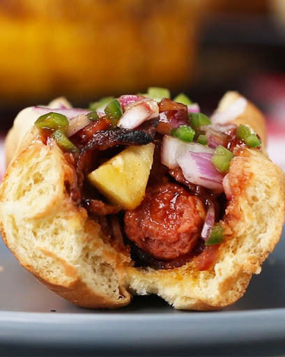 5. Place the hot dogs on the grill and cook gently until the bacon is crispy and the pineapple and hot dog are heated through, about 40 minutes.