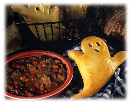 Press 1 Texas™ roll or 2 dinner rolls combined into a tear drop shape. On rounded end, cut down sides 1 1/2-inches to form arms. Pull arms out and tuck pointed ends under. Place on a sprayed baking sheet. Pull bottom of ghost to one side. Indent eyes and mouth with a clean pencil eraser. Brush with egg. Let rise 30 minutes. Just before baking, exaggerate eyes and mouth with pencil eraser. Bake at 350°F 20 minutes, reinforcing eyes and mouth once after 5 minutes of baking. Serve with your favorite soup or chili.