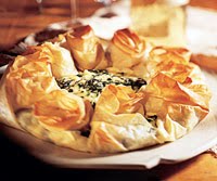 4. Spread the spinach mixture in an 8-inch circle in the center of the pastry. Starting with the last phyllo strip placed in the pan, lift the end of the leaf up and bring it in toward the center of filling. Holding end with both hands, twist end several times; coil and tuck end under to form a rosette. Lay rosette over filling, leaving a 3-inch circle in center (filling should be visible).
