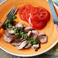 Slice the meat. Top with lots of herb sauce and serve with the tomato.
