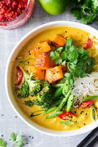 Blend 1st 9 ingredients in NutriBullet. Cook in coconut oil. Add all but noodles. Add them last, as they only need 3-4 min. to cook.