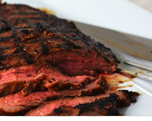 1. 1 1/2 pounds lean flank steak. For the marinade, in a small bowl combine the first 7 ingredients (soy sauce through onion powder). Transfer it to a large zip-top bag, add the steak, seal it, and turn to coat the meat with the marinade. Let stand at room temperature, turning occasionally, for 20 to 30 minutes. (Or refrigerate for up to 4 hours, and remove from the refrigerator 30 minutes before cooking.)