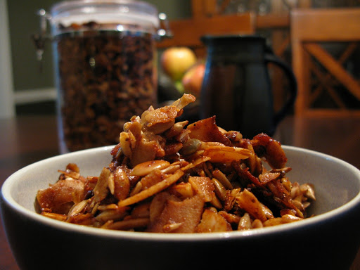 2. Mix coconut, nuts and seeds in a big bowl. Add cinnamon and nutmeg and stir to coat.