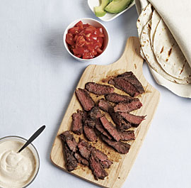 Meanwhile, warm the tortillas on the grill for about 30 seconds per side. Slice the steak across the grain into 1/4-inch-thick slices. Fill each tortilla with some of the steak, lettuce, tomato, avocado, and onion. Drizzle with the sauce and serve.