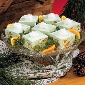 Dissolve gelatin in water. In a bowl, beat cream cheese until fluffy. Stir in gelatin mixture and beat until smooth. Stir in vanilla, oranges, pineapple, soda and pecans. Chill until the mixture mounds slightly when dropped from a spoon. Fold in three-fourths of the whipped topping. Pour into a 13-in. x 9-in. dish. Refrigerate for 3-4 hours or until firm. Cut into squares; garnish with the remaining whipped topping.