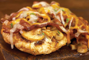 Stack two pieces of cooked bacon, crosswise, on each chicken breast. Spoon the sauteed mushrooms on the bacon, being sure to coat each breast evenly. Spread 1/4 cup Monterey Jack cheese onto each breast, followed by 1/4 cup of Cheddar. Bake the pan of chicken for 7−10 minutes or until the cheese is thoroughly melted and starting to bubble. Sprinkle each chicken breast with 1/2 teaspoon parsley before serving. Place extra marinade in small bowl to serve on the side