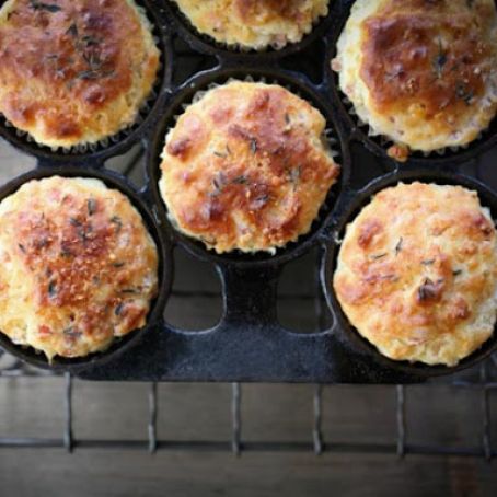 Whisk together the milk, sour cream and eggs in a separate small bowl. Fold in the egg mixture along with the browned onions, the cheeses, ham and thyme into the dry ingredients until just combined (don't fret if there are lumps, this means your batter isn't over-mixed).
