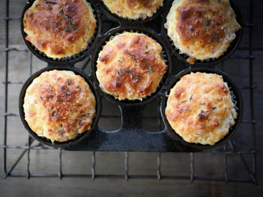 Fill each liner about 3/4 full. Sprinkle with thyme leaves and Parmesan, if desired, and bake 10 minutes. Brush each muffin lightly with butter, sprinkle with a little salt and rotate the pan. Continue to bake until the muffins are golden and a toothpick inserted in the center comes out clean, 8 to 10 minutes longer. Let the muffins rest in the hot muffin pan 3 minutes and serve warm, or cool to room temperature on a rack.