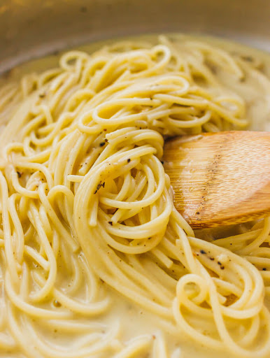 Cacio e pepe is one of the simplest pasta dishes you can make -- spaghetti with melted parmesan cheese and black pepper.