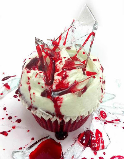 Stab each frosted cupcake with a few shards of broken sugar glass. Drizzle on drops of "blood" to complete the effect.