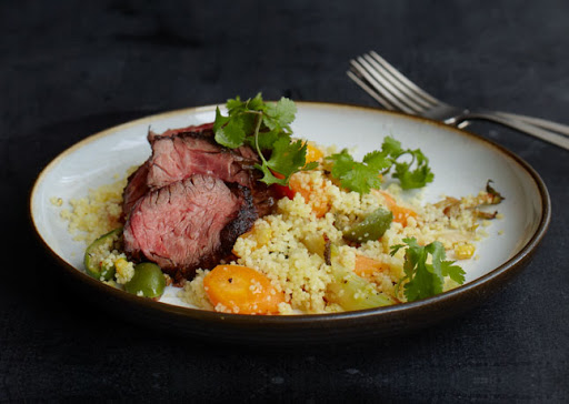 Add broth to skillet and bring to a boil. Stir in couscous. Remove from heat; cover and let steam until tender, 5-8 minutes. Add olives, season with salt and pepper, and fluff couscous with a fork. Slice steak against the grain; fold into couscous. Divide lemon couscous among plates, drizzle with oil, and garnish with cilantro.