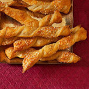 Preheat oven to 400 degrees . Unfold each pastry piece onto parchment-lined baking sheet. Pat until flat; brush with egg. Sprinkle with cheese and sesame seeds; season. Using pizza cutter, cut 1 dough sheet in half crosswise, then cut lengthwise to make eight 1-inch-wide strips. Repeat with remaining dough sheet (you should have 16 strips total). Twist strips; arrange on baking sheet, pressing down ends. Bake until golden, about15 minutes.