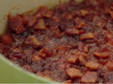 Next add the root beer, cider vinegar, molasses, grainy mustard, red pepper flakes and garam masala. Stir to combine. Then add the beans and bacon, and gently stir so the beans don't lose their shape. Taste for salt and pepper, then pop into the oven, uncovered, until the mixture thickens, about 30 minutes. Remove the beans from the oven, let it cool slightly, and sprinkle with reserved bacon and serve.