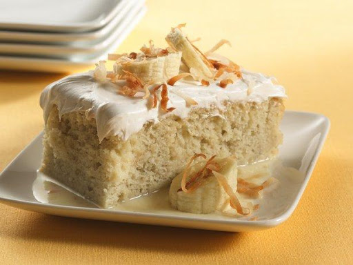 Spread frosting over cake. Garnish each serving with banana slices and/or toasted coconut. Store loosely covered in refrigerator.