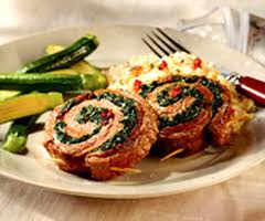 4.) Turn the steak over, with the short end facing you. Spread the spinach mixture over the steak, leaving a 1/2" border on the long sides and 2" border at the far short end. Sprinkle with the cheese. Starting from the closest side, roll up tightly. Tie the steak crosswise with kitchen twine.