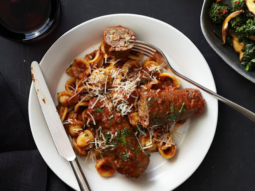 About 20 minutes before serving, bring a large pot of salted water to a boil. Add the pasta and cook as the label directs. Remove the braciole from the sauce and transfer to a platter; remove the toothpicks. Pour half of the sauce on top. Drain the pasta and toss with the remaining sauce. Serve the braciole with the pasta; top with pecorino.