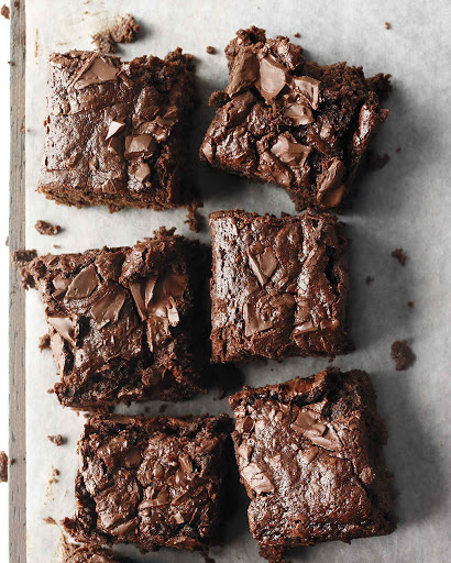 1. Preheat oven to 350 degrees. Butter an 8-inch square baking dish; line with parchment, leaving a 2-inch overhang on all sides. In a medium bowl, whisk together flours, cocoa, baking powder, salt, and baking soda.
