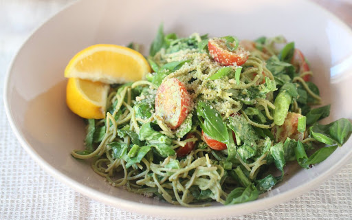 Spaghetti with Green Tahini Sauce & Brazil Nut Parmesan - Vegan, Gluten-Free