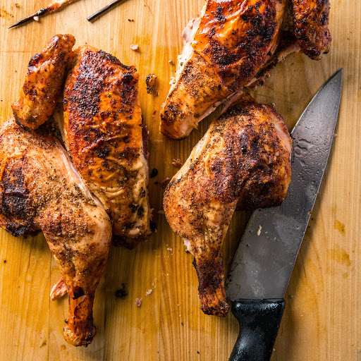 5. Transfer chicken, skin side up, to carving board; tent with aluminum foil; and let rest for 15 minutes. Remove skewers and carve chicken. Serve.