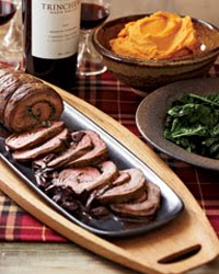 2. Meanwhile, preheat the oven to 375° and set a rimmed baking sheet on the center rack. In a bowl, combine the garlic, cheese, sage and rosemary. On a work surface, pound the steak 1/2 inch thick and season with salt and pepper. Spread the herb mixture on one side of the steak and roll it up lengthwise, with the grain; tie with string at 1-inch intervals.