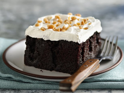 Spread whipped topping over top of cake. Sprinkle with toffee bits. Store covered in refrigerator.
